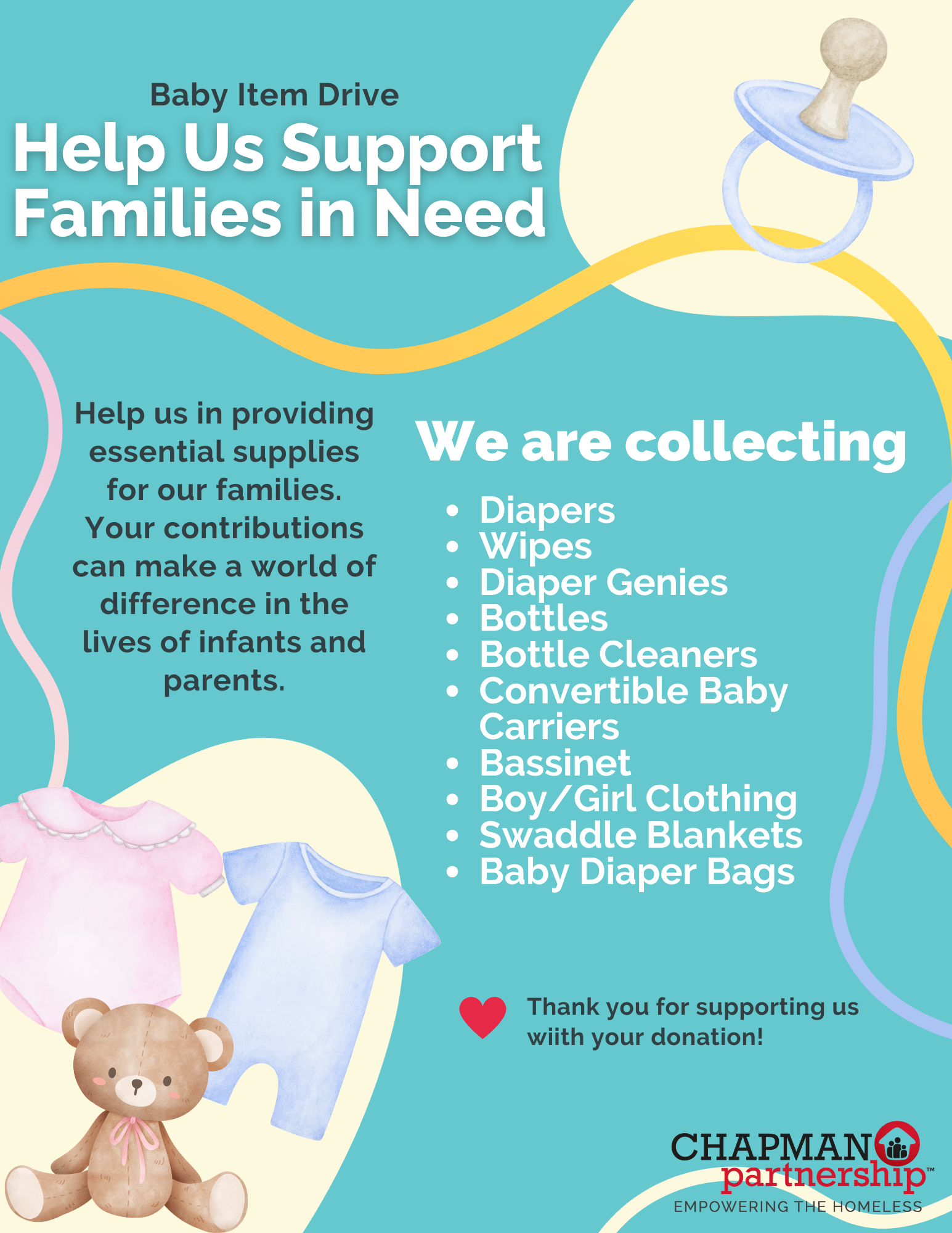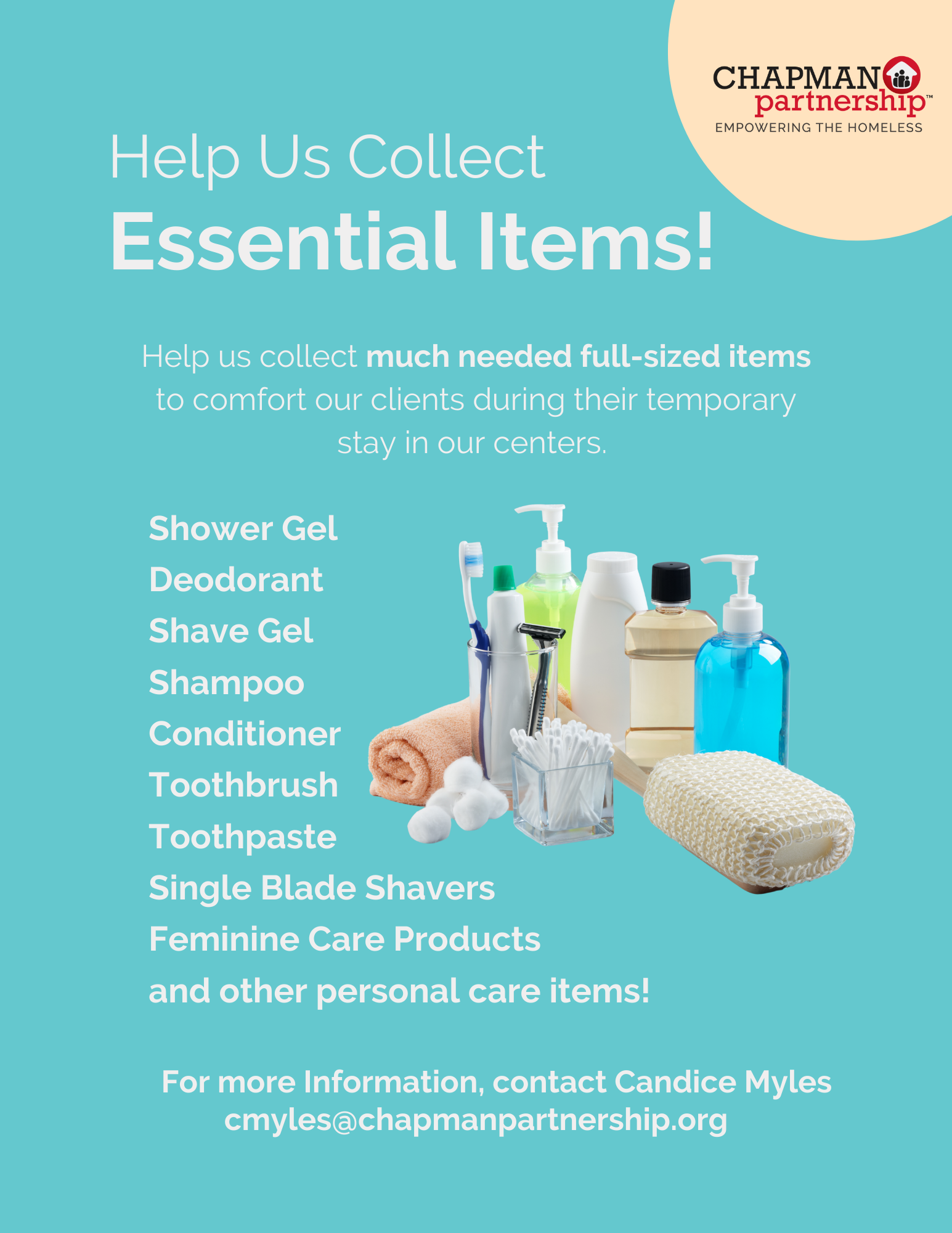 If you would like to host a donation drive, please contact Chapman Partnership first, so we can let you know what items we may be in need of, as those needs change throughout the year.